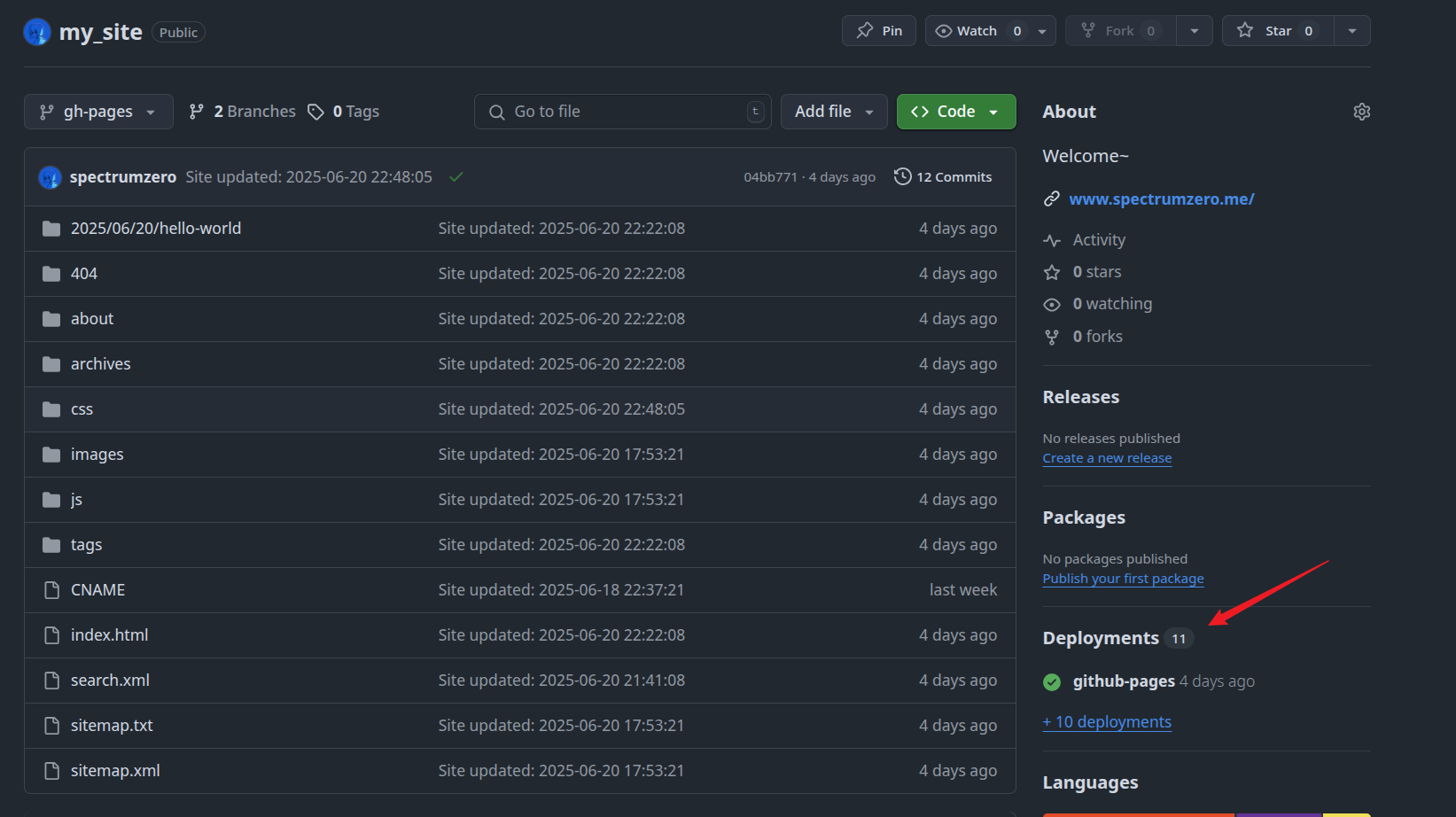 当github-pages旁边的图标变成绿色的,我们就完成了部署,可以直接通过域名访问更新后的网站了,在地址栏输入github.username.io或github.username.io/sitename即可。