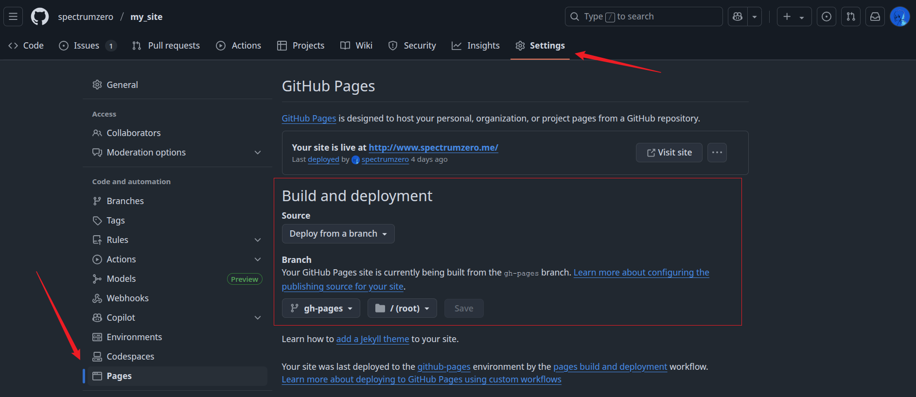 注意,之所以将分支设置为gh-pages,是为了将整个项目的源代码和经过生成部署后的产物分开,以便更好地管理我的整个网站项目。在部署的时候,部署产物(Build Output)将会被推送到gh-pages分支,在此之后,自己则可以选择是否要将源代码推送到 main 分支。